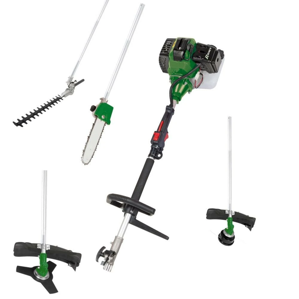 SystĂšme de refroidissement par air. Rapport de compression 9 : 1.RĂ©servoir essence 1200 ml. DĂ©marrage manuel par cordon.PoignĂ©e de commande sur manche moteur. Longueur totale du manche 1,50 m (manche moteur + manche outil).âą Taille-haies : lame 395 mm. TĂȘte articulĂ©e avec verrouillage 13 positions (270°). Coupe de branche max Ă 24 mm. 2 fourreaux de protection de la lame.âą Ălagueuse : Vitesse maxi de la chaĂźne : 16 m/sec. Lubrification automatique de la chaĂźne. RĂ©servoir huile de chaĂźne 150 ml. Guide-chaĂźne, chaĂźne et fourreau de protection. âą DĂ©broussailleuse : lame mĂ©tal 3 dents double affĂ»tage. Carter de protection en polypropylĂšne. âą Coupe-bordures : se fixe Ă la place de la tĂȘte de dĂ©broussailleuse. 2 fils nylon 2,5m de Ă 2,4 mm. Avance semi-automatique du fil. Carter de protection de la dĂ©broussailleuse. LivrĂ© avec une sangle de maintien rĂ©glable avec Ă©paulette, 1 bidon de mĂ©lange 600 ml, 1 clĂ© Ă bougie multifonctions, 2 clĂ©s Allen, 1 clĂ© plate, 1 tournevis Ă lame rĂ©versible