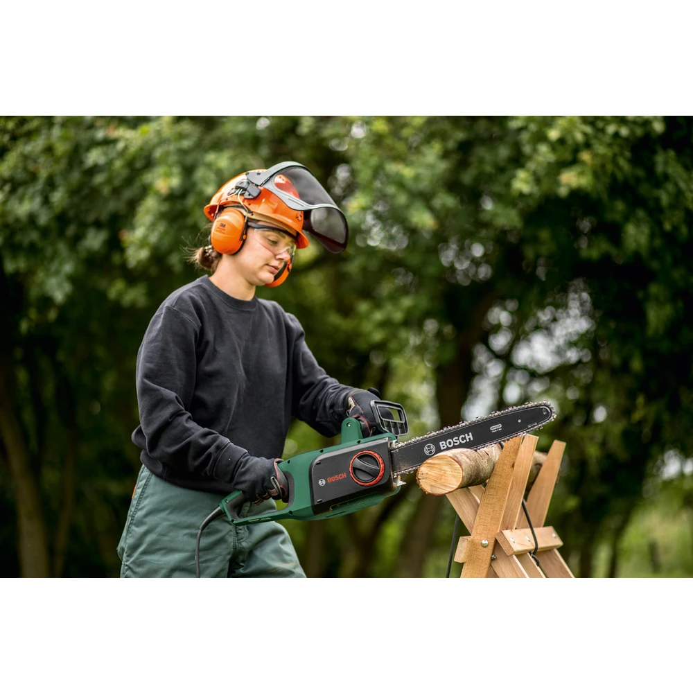 Fidèle à sa réputation de longue date, Bosch propose avec cette tronçonneuse un outil offrant une puissance et une qualité de coupe incomparable tout en garantissant à ses utilisateurs une facilité et un confort d’utilisation en toutes circonstances. La poignée ergonomique de la Tronçonneuse à chaîne UniversalChain 35 ainsi que les nombreuses innovations spécialement étudiées par les ingénieurs de Bosch sont pour vous l’assurance de toujours entreprendre vos travaux d’élagage et de découpe sans efforts et en toute sécurité. Les atouts de votre tronçonneuse électrique à chaîne UniversalChain 35 sont nombreux et en font un outil d’exception pour que travailliez de nombreuses années en toute confiance avec elle. Cette tronçonneuse est d’une fiabilité et d’une robustesse à toute épreuve. La liste de toutes ses qualités est non exhaustive tant elle révèle tout son potentiel au fil de ses utilisations : Tronçonnage précis : moteur de 1800 W et chaîne chromée de qualité. Utilisation simple grâce à sa légèreté (A peine 4,3 kg avec chaîne et guide compris) d’une part et à sa maniabilité (Système SDS Bosch permettant d’ajuster la tension et de changer sa chaîne sans outil) d’autre part. Qualité : design robuste pour une grande durée de vie. Vitesse élevée de sa chaîne (12 m/s) pour des capacités de coupe optimales. Frein de chaîne à réaction ultra-rapide (Quick Stop) garantissant sa sécurité d’utilisation. Poignée ergonomique pour scier et tronçonner sans effort des troncs de diamètre jusqu’à 35 cm. Griffes de maintien et maillon intermédiaire de sécurité en acier. Grand réservoir d’huile de chaîne (200 ml) avec indicateur de remplissage. Tronçonneuse électrique filaire Bosch UniversalChain 40.